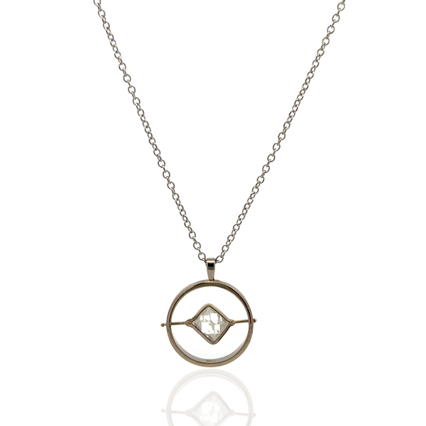 This stunning diamond pendant is the perfect accessory to add a touch of elegance to any outfit. Made with 14k white gold, the pendant features a spinning raw octahedron diamond with a weight of 1.5 carats. The diamond is beautifully cut and sparkles in the light, making it a true statement piece. The pendant hangs from a 16' cable chain, adding a delicate touch to the overall design. This pendant is a must-have for any jewelry lover and is sure to become a cherished piece in your collection.