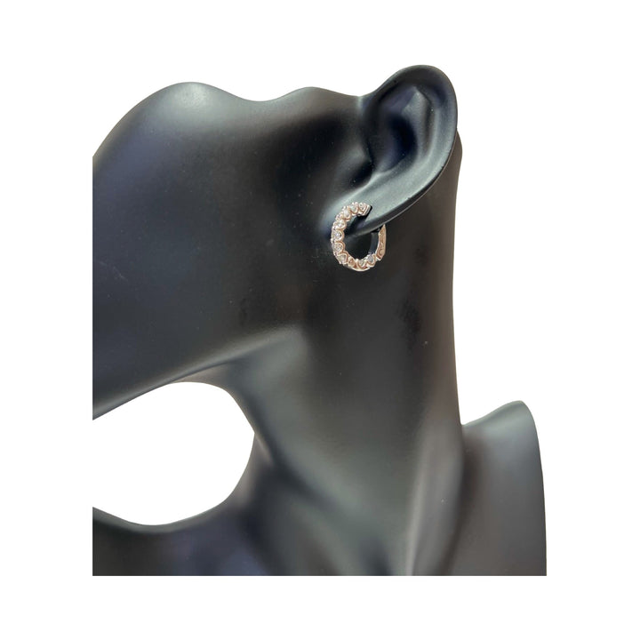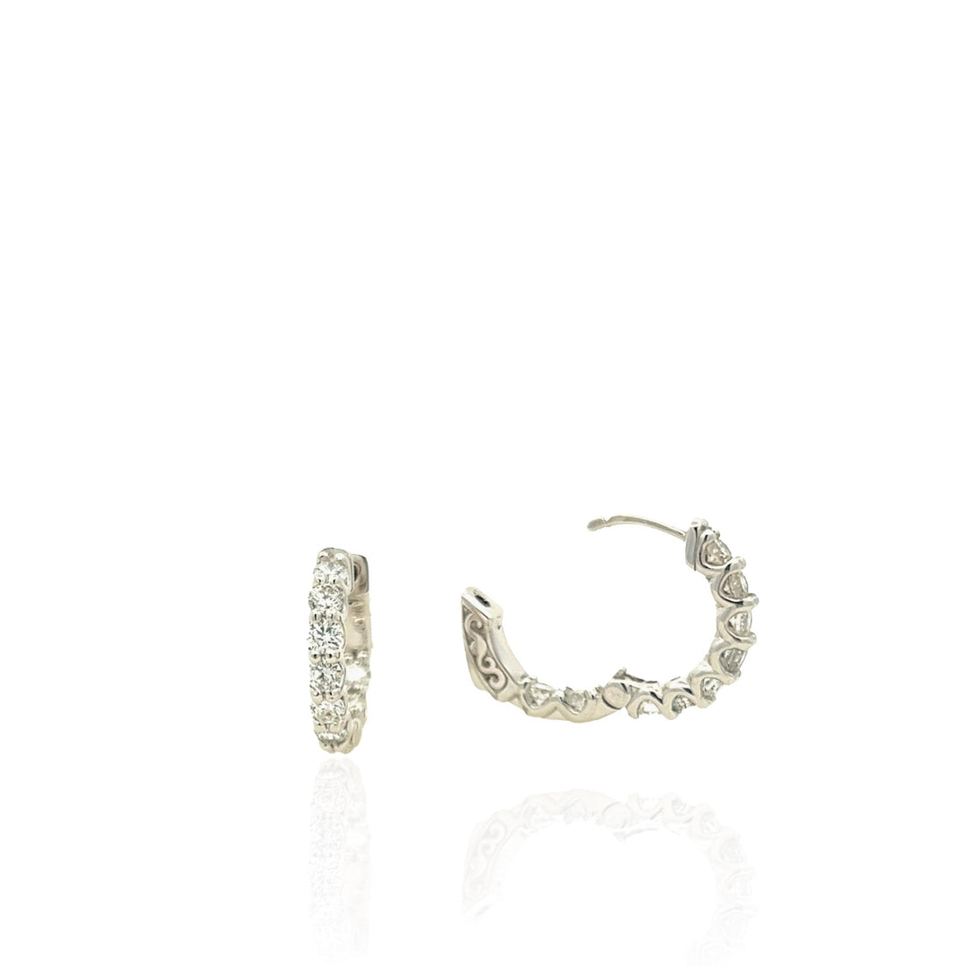 This classic 14 karat white gold pair of hoop earrings features a spectacular inside/outside stone setting arrangement, consisting of a single row of full cut diamonds. A total of 18 diamonds measuring 2.9 mm, weighing combine 1.80 cttw and grading G color SI1 clarity sparkle across these 20 mm hoops. This is a visually impressive look as the front portion is lined with diamonds but the rear interior section is also set with a row of diamonds, giving an almost three dimensional appearance of a constant stream of fire and sparkle.