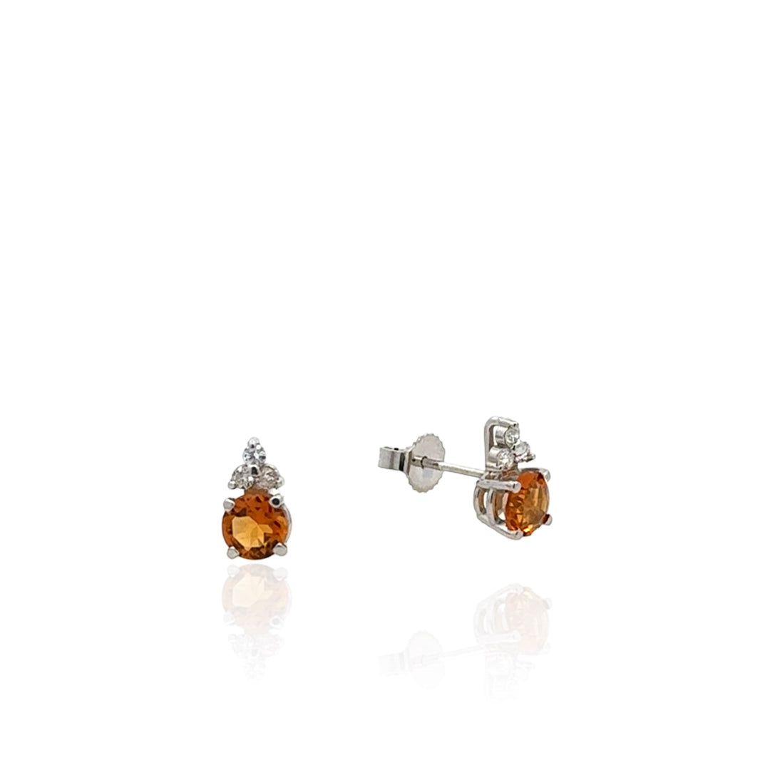 These 14K white gold earrings feature two 6mm round citrines accented by six round diamonds totaling 0.13ctw, adding a vibrant pop of color with sparkling detail.