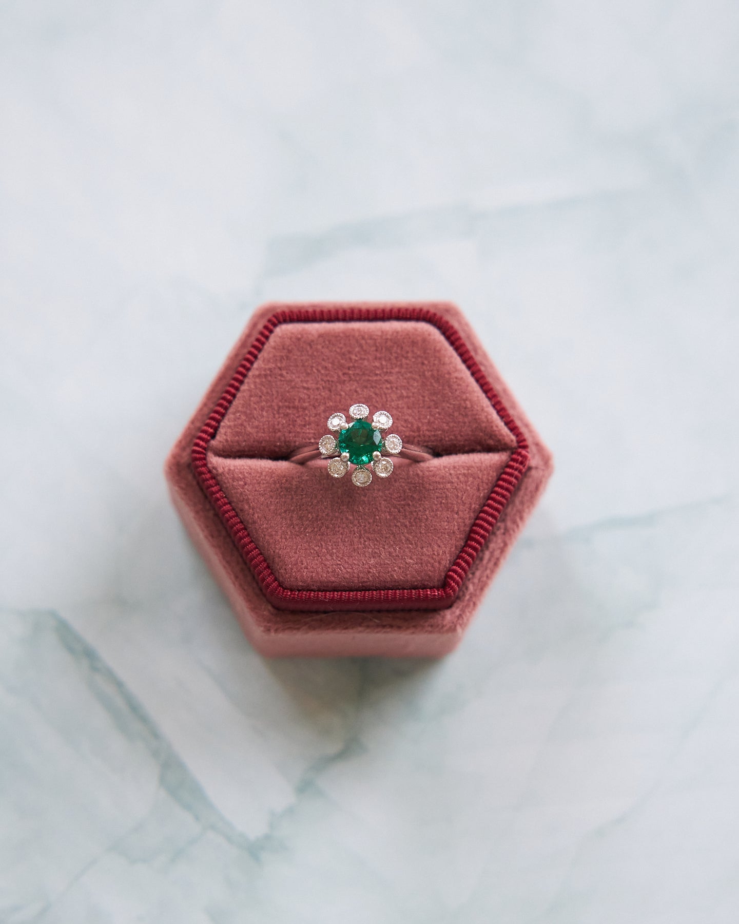Resembling the beauty of a flower blossom, this round emerald ring in 18 karat white gold captivates the eyes at a glance. 8 full cut round diamonds weighing .16 cttw are bezel set with a milgrain edge and arranged in a floral pattern around a centric 5.5 mm bright prong set ruby weighing .57 carat. This classic motif measures 15 mm across and rises 6 mm up off the finger.