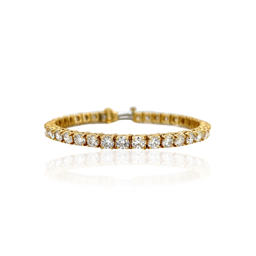 This classic diamond line bracelet, crafted in 14 karat yellow gold, holds 36 full cut diamonds in low set 4 prong settings. Each diamond measures 4.25 mm grades H color VS clarity and they weigh combine 11.07 cttw. It measures 7 inches long and secures with a push lock safety clasp. Timeless when worn alone and on trend mixed into a stack for a layered look.