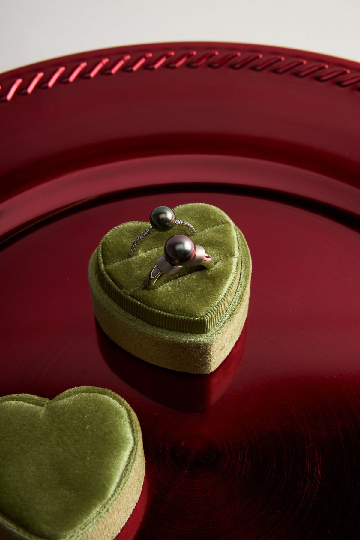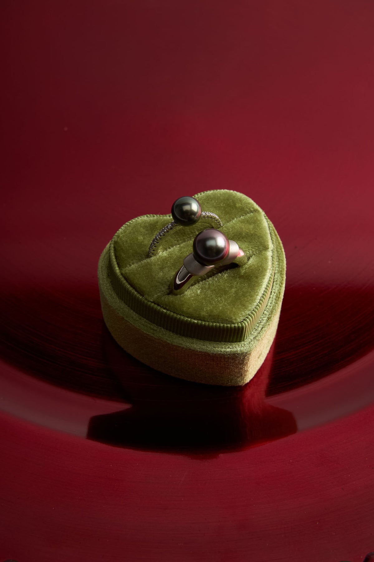 If you are looking for a minimally designed pearl ring, your search stops with this beautiful Black Tahitian pearl piece. The 8 mm, high luster, dark grey flashing pearl rises up from a 14 karat white gold shank glistening with prong set diamonds down each shoulder. The diamonds weigh combine 0.08 cttw and perfectly balance the inky darkness of the pearl. This ring rises 13 mm up off of the finger.