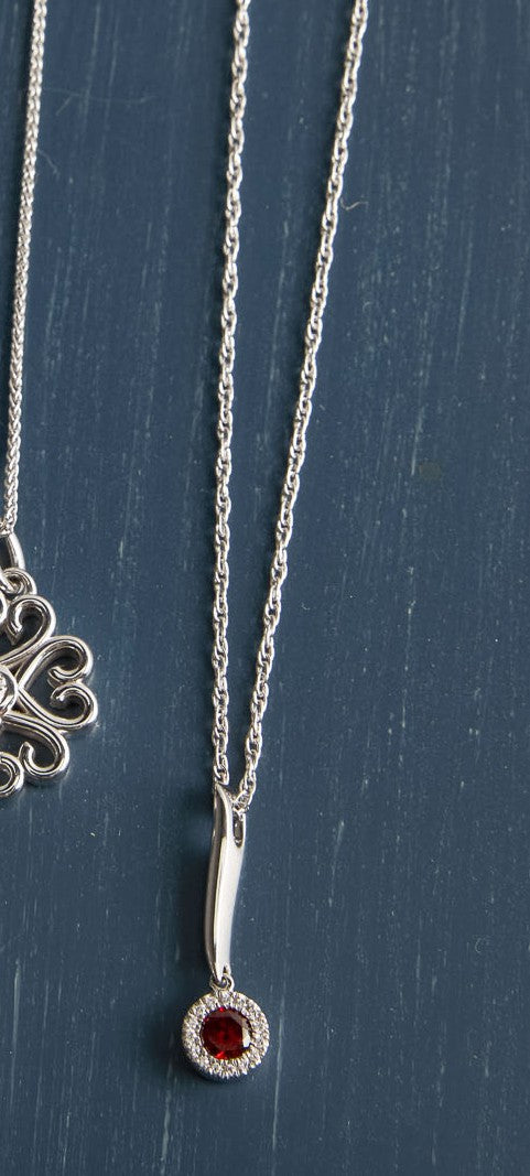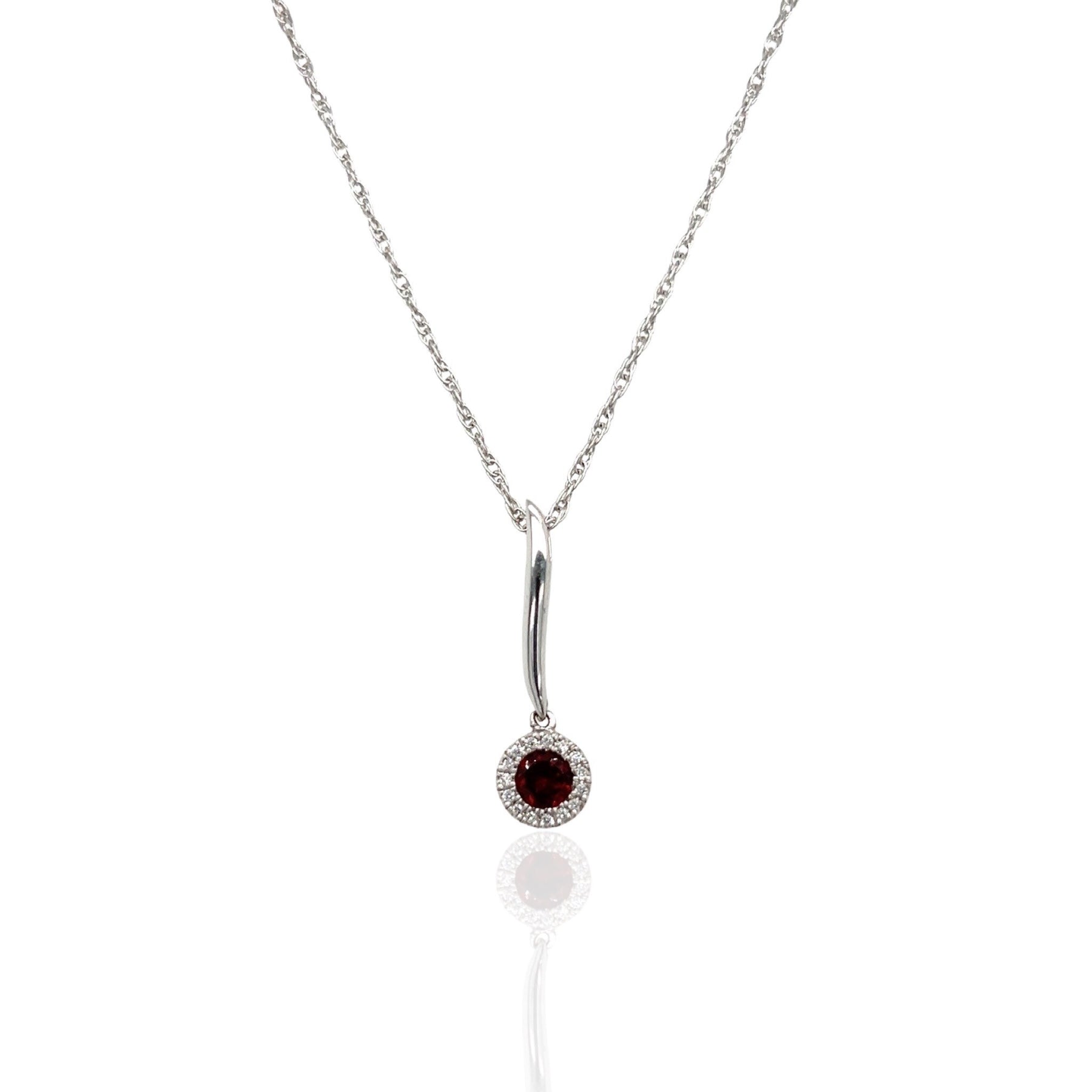 This lovely14 karat white gold necklace holds an .25 carat round ruby with a halo of .06 carats of round brilliant diamonds. The red of the ruby is accented by the delicate sparkle the halo of diamonds provide. The pendant drops from a high polish curved element which provides extra movement to the pendant. The pendant comes on a rope chain which secures with a lobster claw clasp.