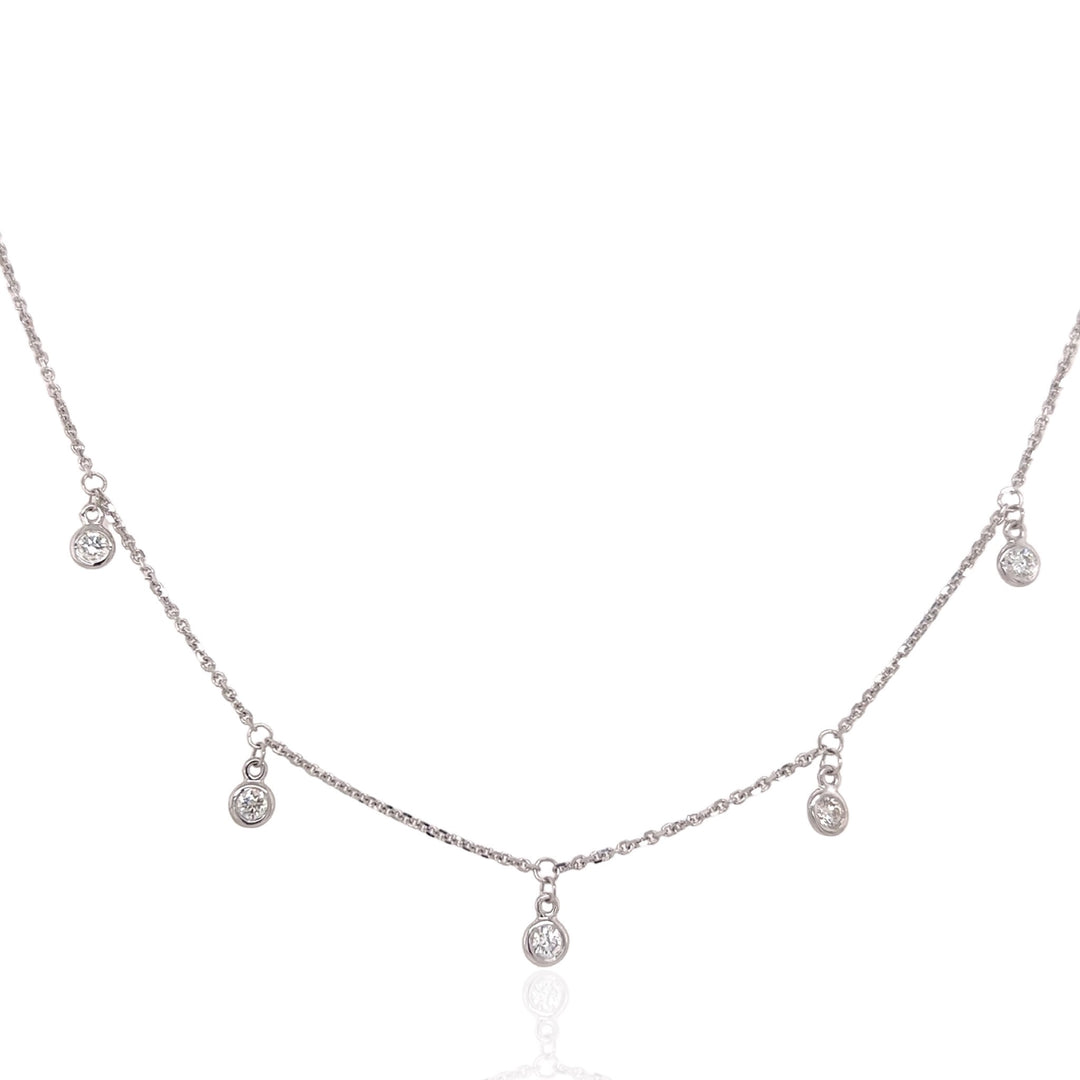 A reinvention of the classic solitaire pendant, this station necklace features 2.3 mm bezel-set full cut diamonds sprinkled along the chain. The 5 diamonds weigh a combine .28 cttw and dangle from the chain providing additional movement and sparkle. The 14 karat white gold chain is 18 inches long with the option to be worn at 17 inches for a convertible look that adds to the versatility of this piece. It secures with a lobster claw clasp.