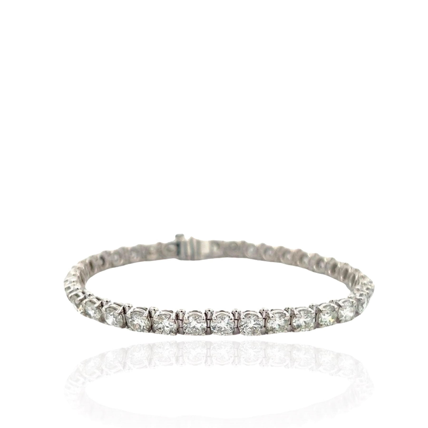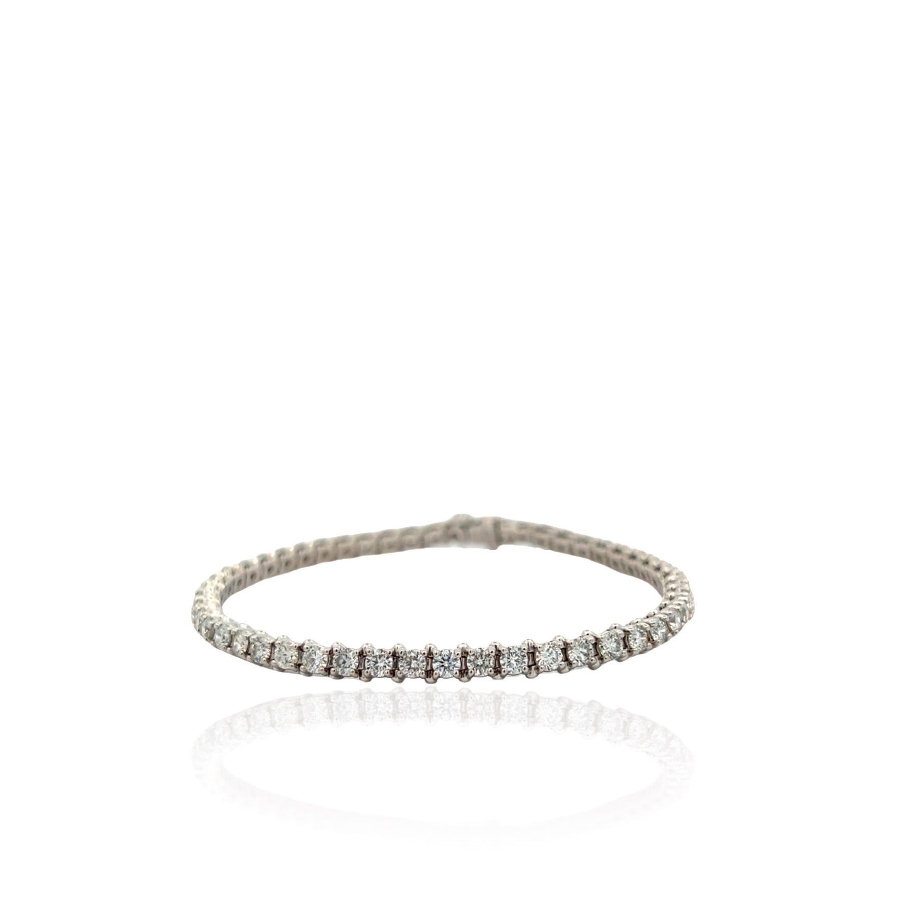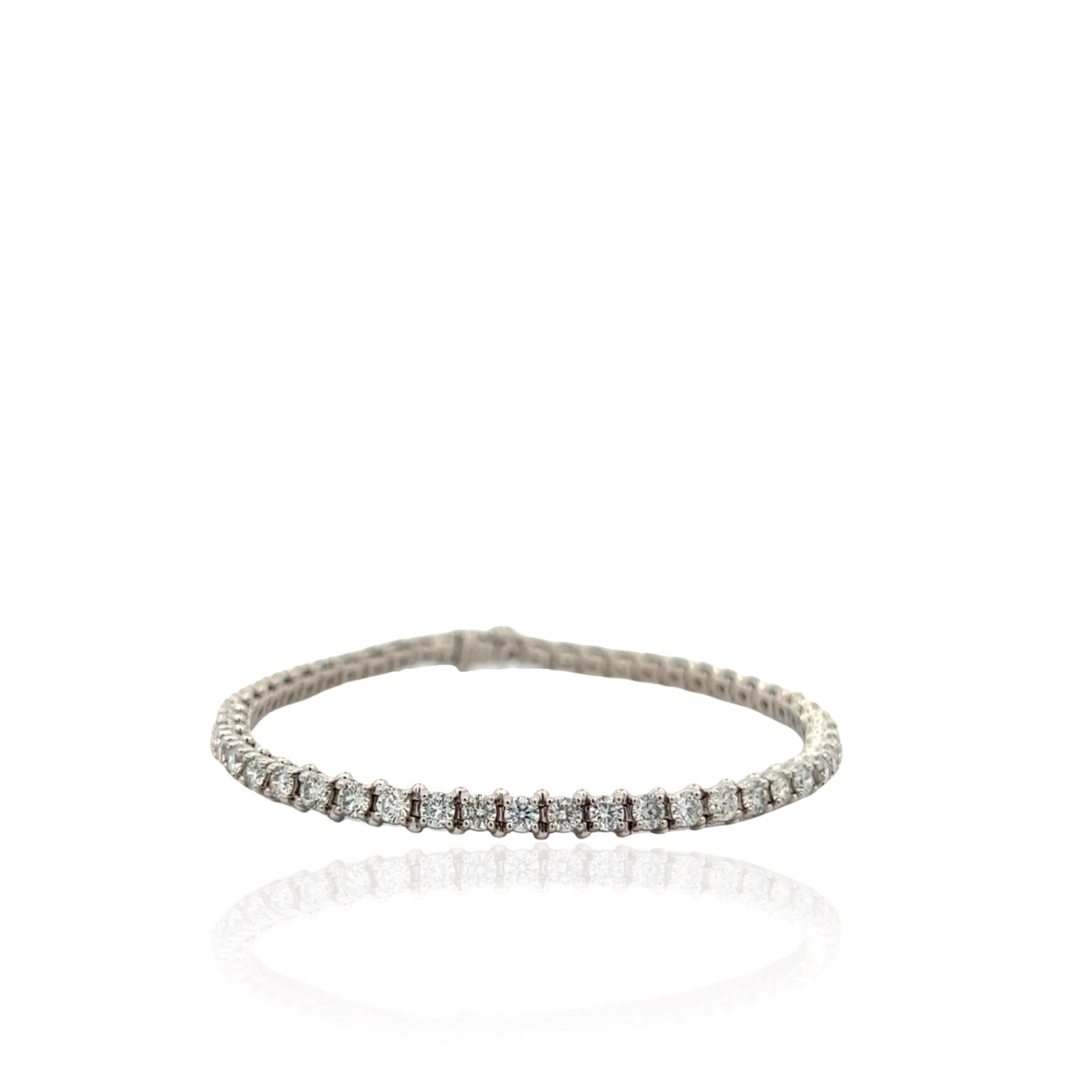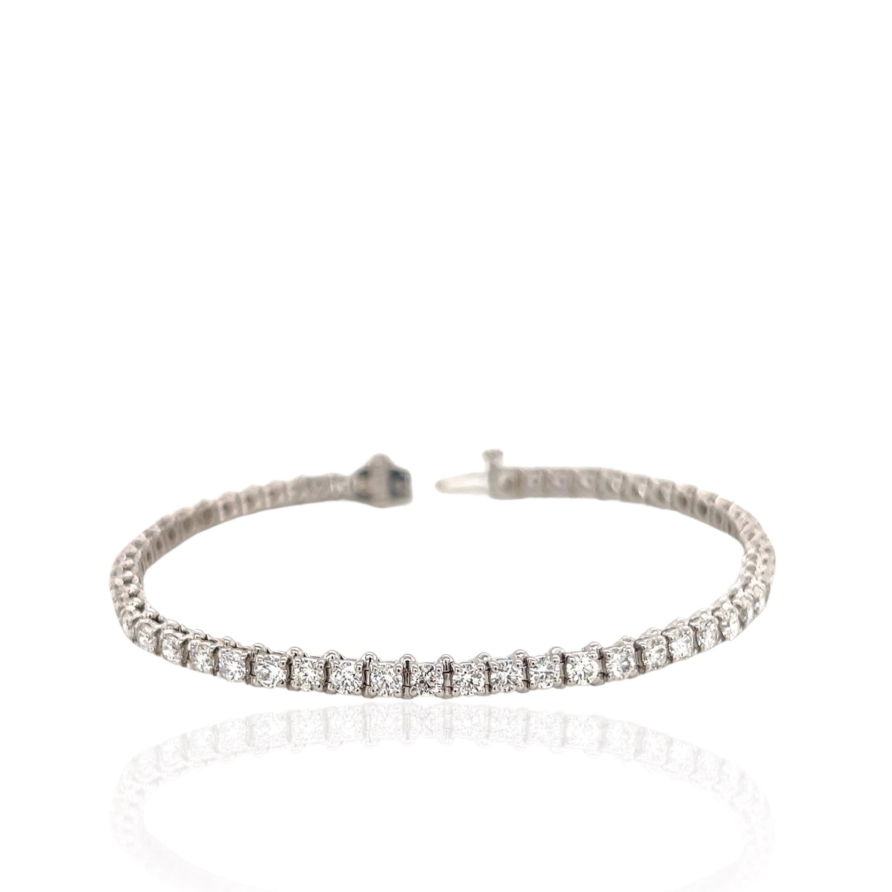This classic diamond line bracelet, crafted in 14 karat white gold, holds G/H color SI1 clarity full cut diamonds in low set 4 prong settings. It is available in 7 different total carat weights of diamonds. It measures 7 inches long and secures with a push lock safety clasp. Timeless when worn alone and on trend mixed into a stack for a layered look.
