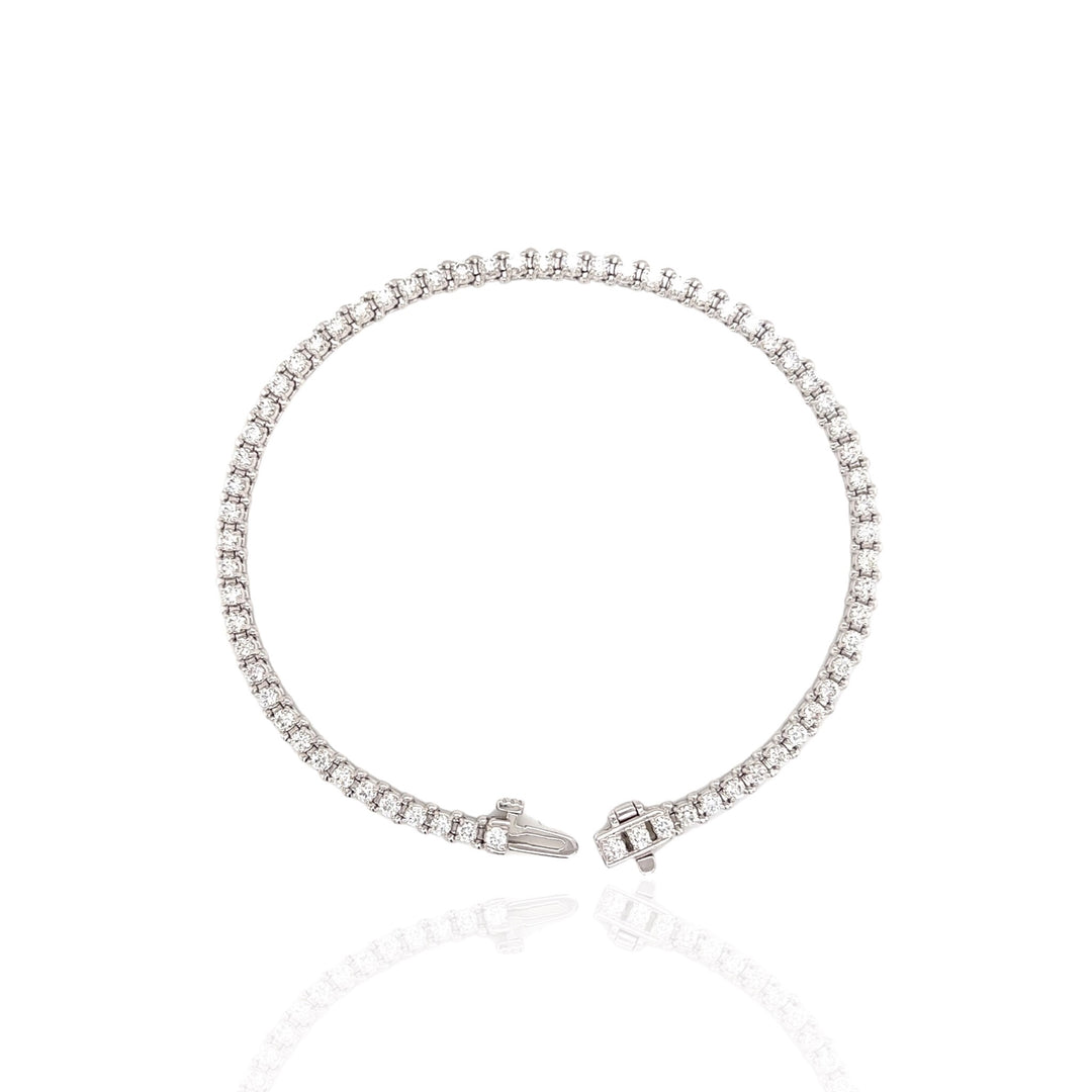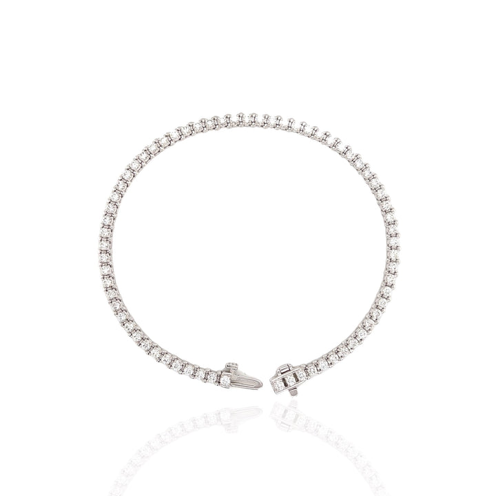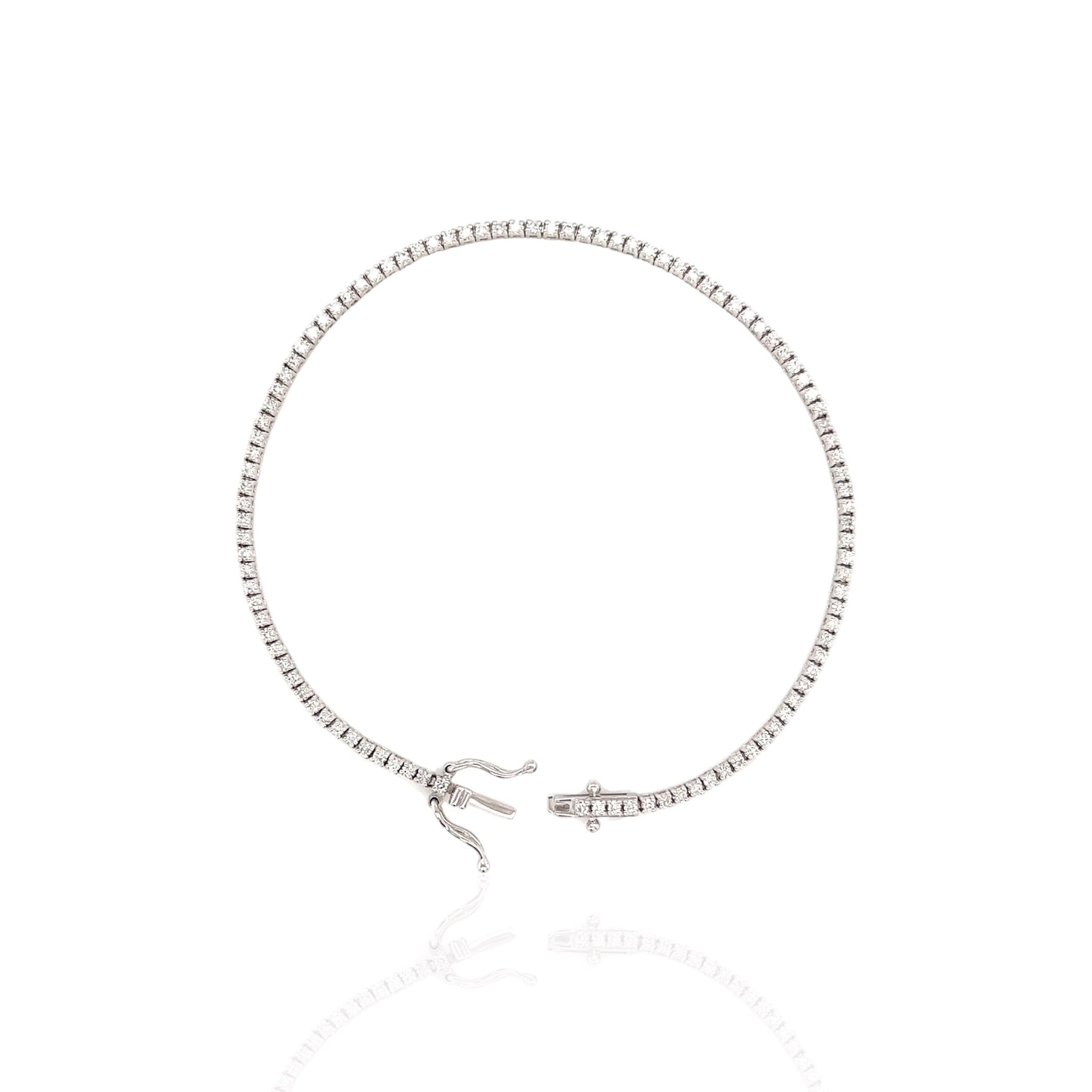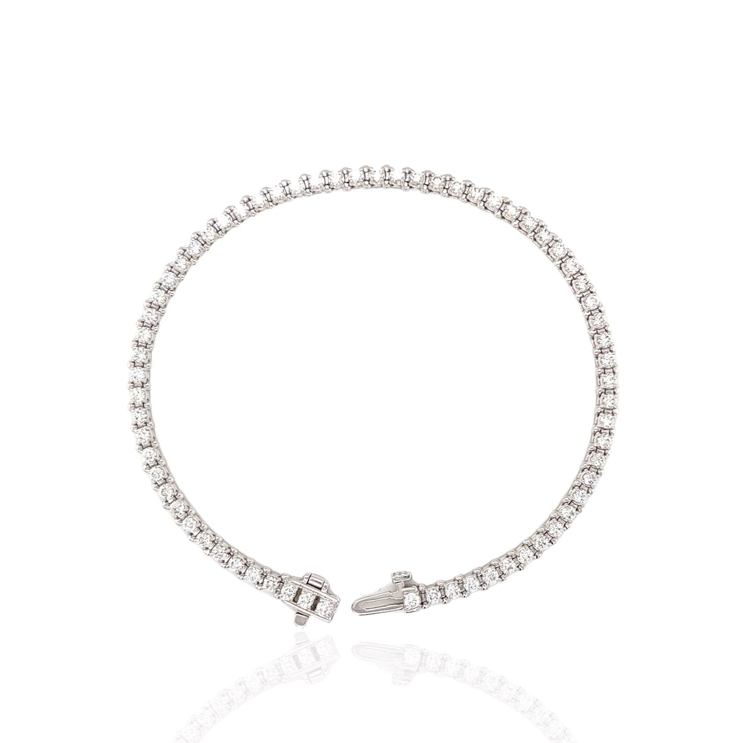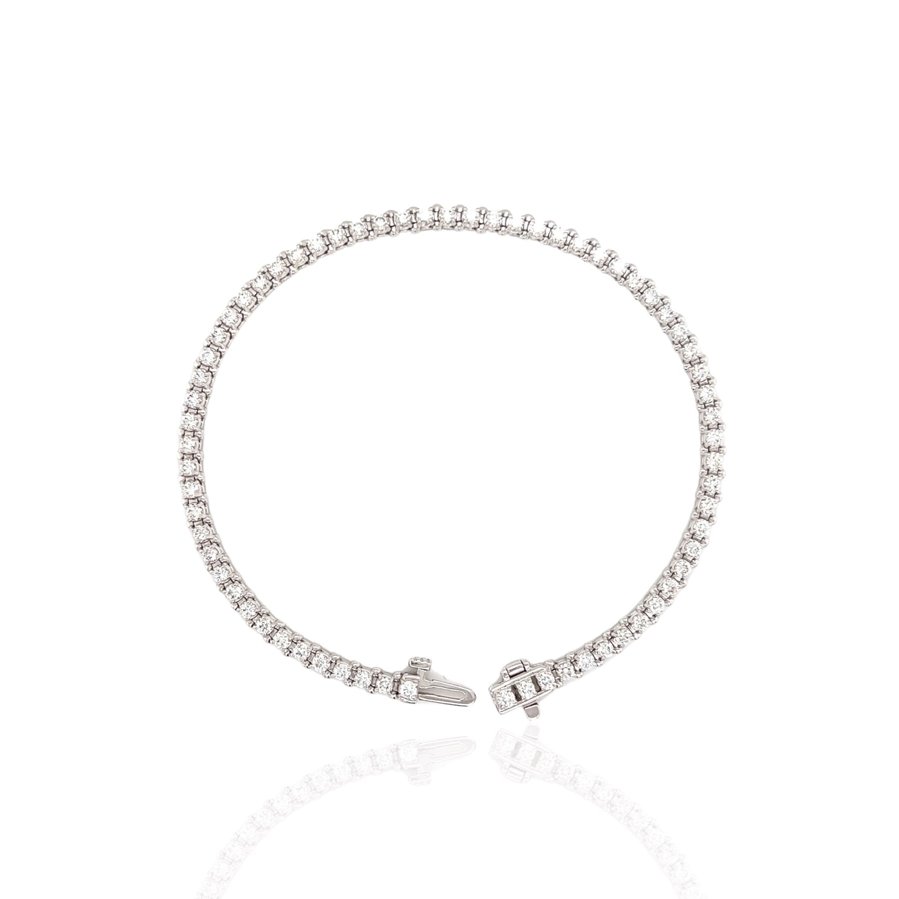 This classic diamond line bracelet, crafted in 14 karat white gold, holds G/H color SI1 clarity full cut diamonds in low set 4 prong settings. It is available in 7 different total carat weights of diamonds. It measures 7 inches long and secures with a push lock safety clasp. Timeless when worn alone and on trend mixed into a stack for a layered look.