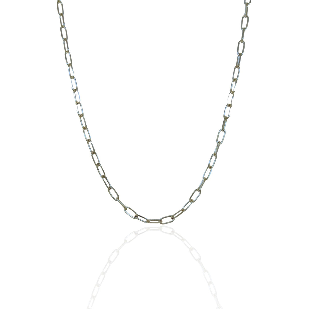 A 14 karat white gold 18 inch paperclip chain with a lobster claw clasp.