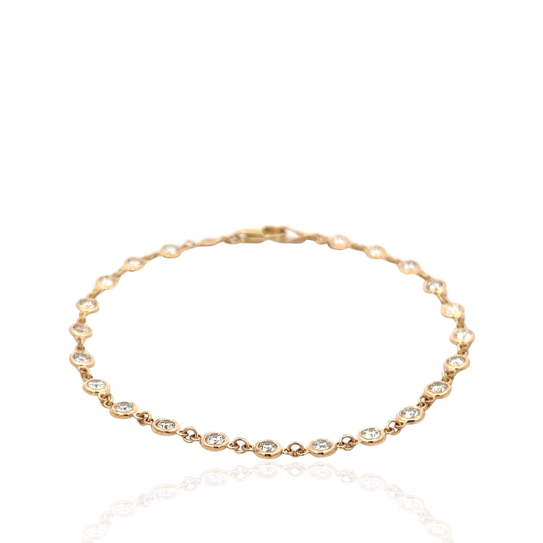 24 beautiful bezel to bezel set 2.5 mm diamonds perfectly contrast the 14 karat yellow gold on this simple, yet sophisticated bracelet; a modern essential for any stylish woman. The diamonds weigh combine 1.57 cttw. The bracelet secures with a lobster claw clasp and measures 7.5 inches long. Add understated glamor to a day or evening look with this elegant piece that can be worn alone or in a stack for a layered look.