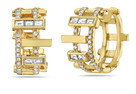 These stunning diamond earrings are the perfect addition to any jewelry collection. Made with 14k yellow gold, the geometric hoop design adds a modern touch to the classic earring style. Each earring features 10 round baguette diamonds and 46 round brilliant diamonds, totaling .12 carats. These earrings are the perfect combination of elegance and sophistication, making them a must-have for any special occasion or everyday wear. Upgrade your earring game with these beautiful diamond earrings.