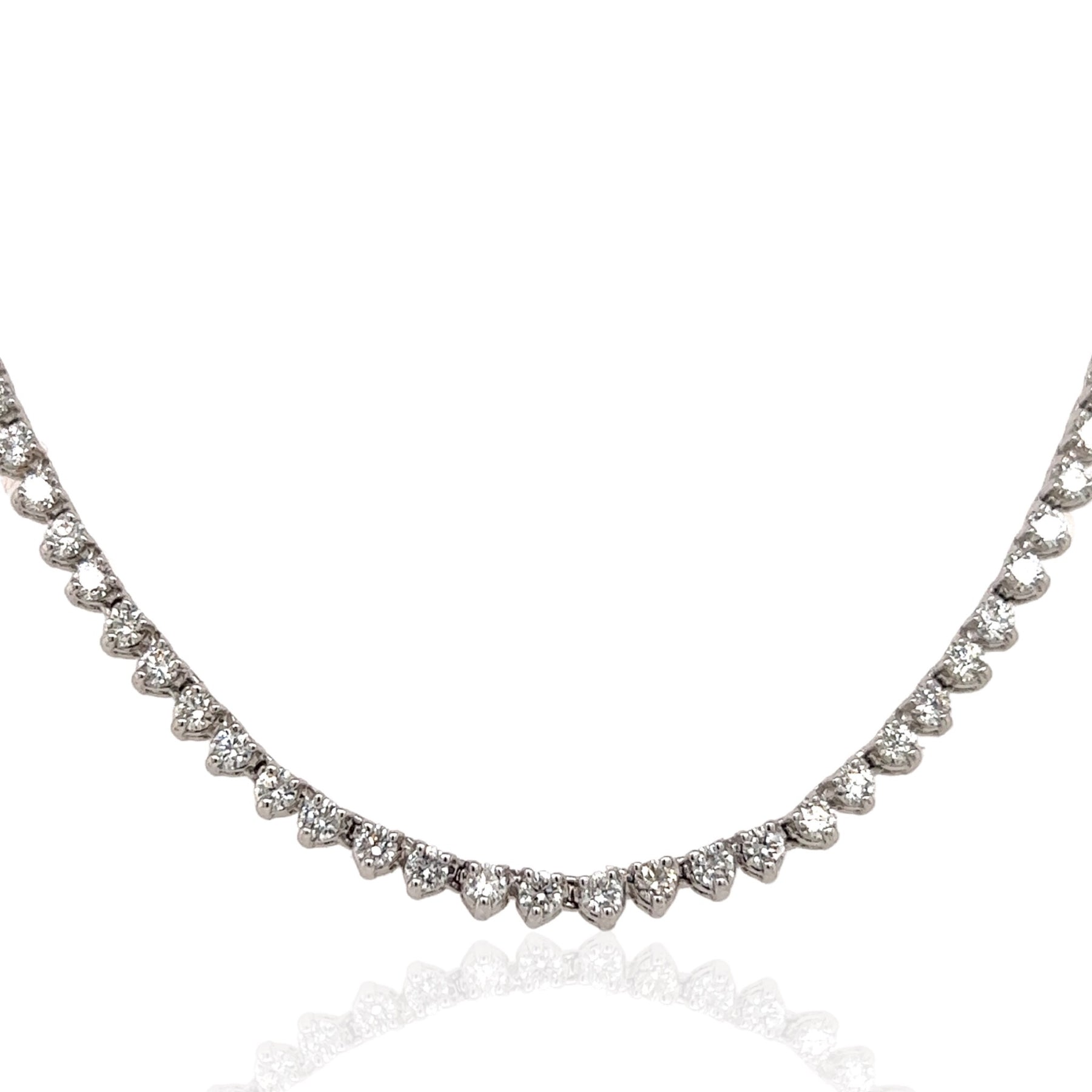 Add a touch of elegance to your outfit with this stunning diamond necklace. Crafted with 14k white gold, this necklace features a 3 prong straight line design adorned with 141 round brilliant diamonds, totaling 14 carats. The diamonds are of G-H color and SI1 clarity, ensuring a beautiful sparkle and shine.